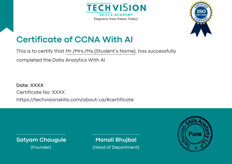 The CCNA course at TechVision Skills Academy provides a strong foundation in computer networking, covering routing, switching, security, wireless, and automation concepts through practical, hands-on learning. Designed for freshers, non-IT learners, and working professionals, this course prepares students for real-world networking roles and the globally recognized Cisco CCNA certification.