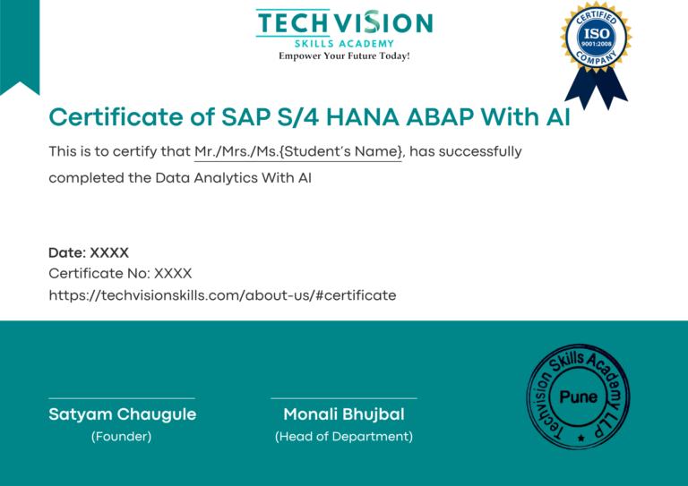 Completion of all practical assignments, hands-on labs, and exercises covered in the trainingTechVision Skills is one of the leading Advanced SAP ABAP Training Institutes in Pune offering job-oriented training, real-time project exposure, and expert SAP-certified trainers. The institute provides both beginner and advanced SAP ABAP courses aligned with current industry requirements.
